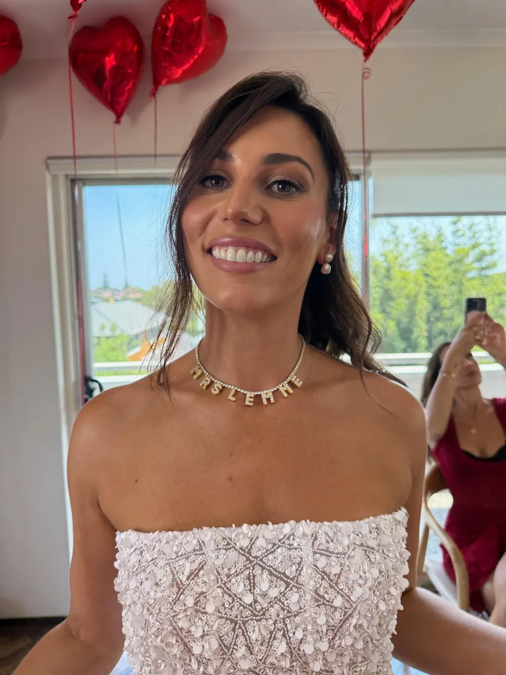My bridesmaids got me a custom necklace for my hens and it is stunning. It looked so good in person and in photos. I ended up wearing it with my second dress for my wedding and my recovery!!